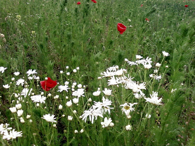 Выехали из Киева не спеша в 10 утра в субботу, 6-го июня. Потолкались по дороге на Житомир с фурами и автобусами, поближе к областному центру выбрались из толчеи, выдохнули, проехали полгорода и наткнулись на гаишные посты, без особых объяснений запрещающие ехать по обычной трассе. Пояснения по поводу объездной дороги сводились к маханию руками в разные стороны. Потом выяснил, что по маршруту нашего (и не только) движения проходила отчетно-выборная конференция региональной организации Народного Союза «Наша Украина». Выбравшись из Житомира почти через час, далее уже получали удовольствие от наших украинских пейзажей. Благо, незагруженная трасса позволяла это делать. Полюбовались на украинские самолеты на военном аэродроме в Староконстантинове, с которого в свое время угоняли в Россию, аки иномарки, стратегические бомбардировщики. Дабы не достались нерадивым хохлам. Сейчас там, в основном, учебные истребители и штурмовики (насколько я разбираюсь). Место для перекуса подсказала природа. Под Хмельницким после поворота слева открылось прекрасное маковое поле.