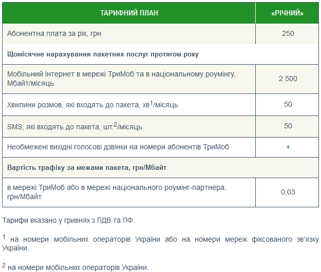 Компания «ТриМоб» объявила о запуске нового тарифного плана «Річний» / «Годовой», в рамках которого абненты получат 2,5 ГБ трафика, 50 минут и 50 SMS в месяц, а также бесплатные звонки в рамках сети, заплатив абонплату в 250 грн один раз в год.
