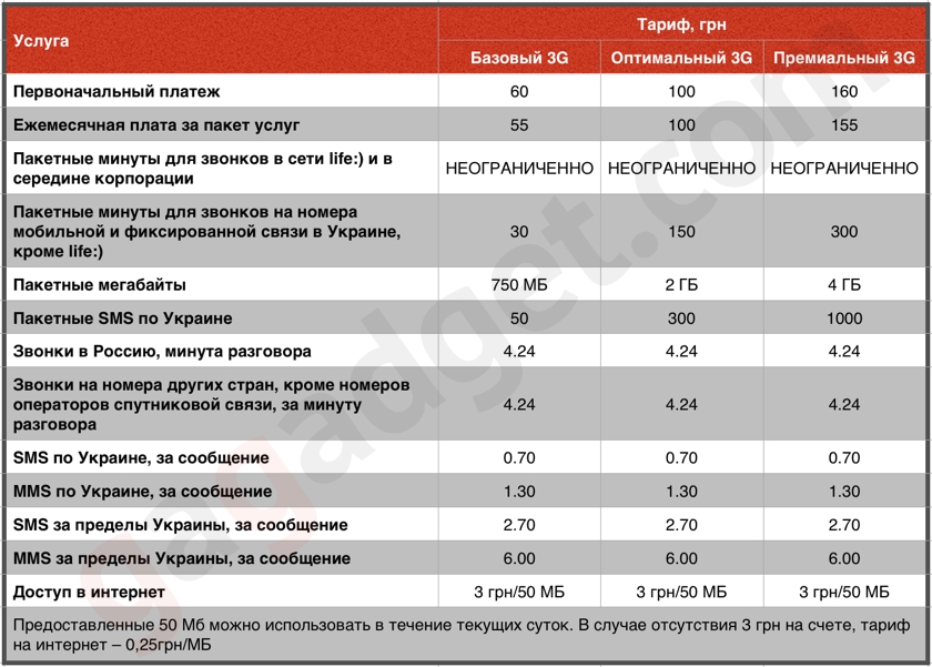 После использования указанных лимитов вступает в силу тарификация 3 гривны за 50 мегабайт, также доступны дополнительные пакеты трафика от 1 гигабайта за 50 гривен до 8 гигабайт за 225 гривен.
