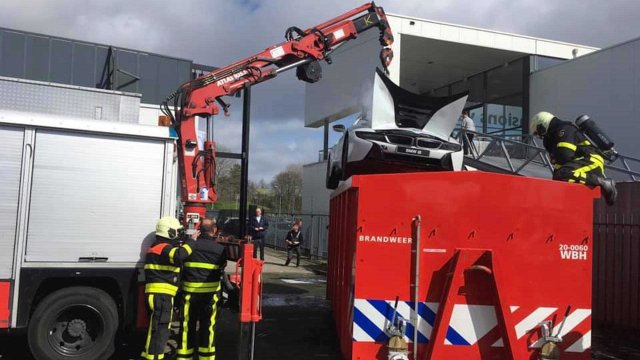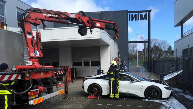 У Нідерландах загорівся гібридний BMW i8. Щоб загасити пожежу, співробітники пожежної служби дістали спорткар з автосалону і втопили його у сміттєвому контейнері. Тепер втоплене BMW i8 зовсім не підлягає відновленню.