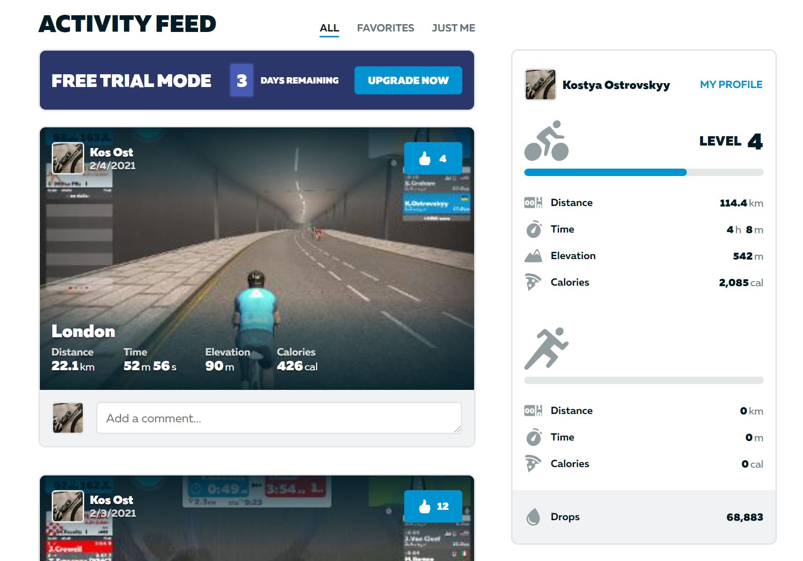 Легкий апдэйт. Trial Period Zwift дает тоже на 7 дней и только после оформления подписки. То есть, сразу после регистрации у тебя есть 25 км на пробу функций, обучение и тд. По проезду 25 км нужно таки оформлять подписку. Иначе не работает ничего, кроме дэмо. После оформления подписки выдают 7 дней tall free на подумать, пока абонплату за первый месяц не снимут. Подписался. Февраль таки точно дома катать буду. Заснежило все у нас, -5...