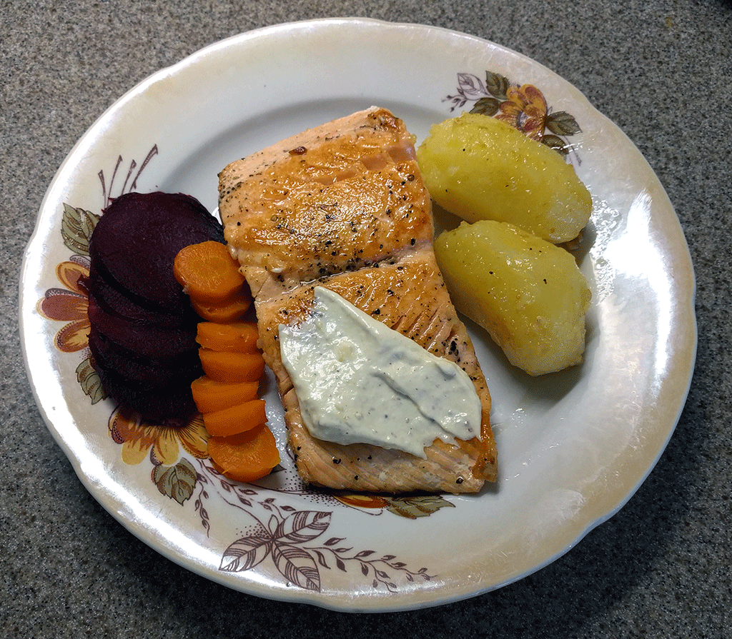 Зы. Половина рыбной порции на фото ушла мелкому в тарелку, вернее это и есть его разбивучая тарелка, он со мной поделился половиной рыбки . Сначала выложил все, потом лень уже было переделывать..