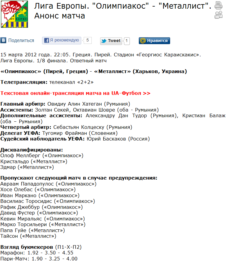 Ждем от Металлиста новых успехов. На Олимпиакос уже наверное пойду болеть с Нико-лаевичем (бум болеть за весь клуб