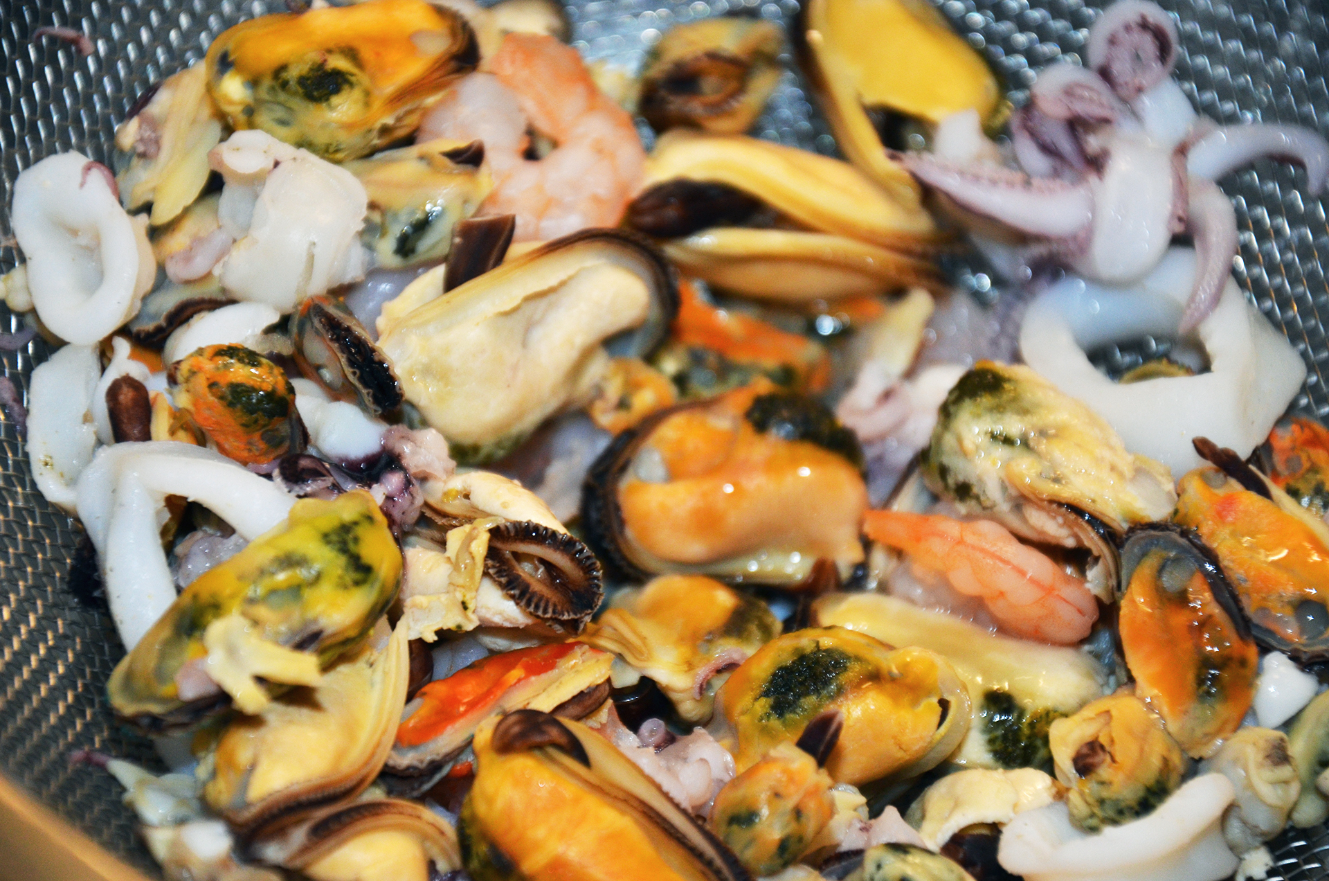 Морской коктейль подержать ночь в нулевке. Потом сварить в кипящей воде минуты 3-5, в зависимости от обьема продукта. Можно варить прямо в сите. В воду добавить хорошую ложку соли и ложку сахара, можно немного уксуса.