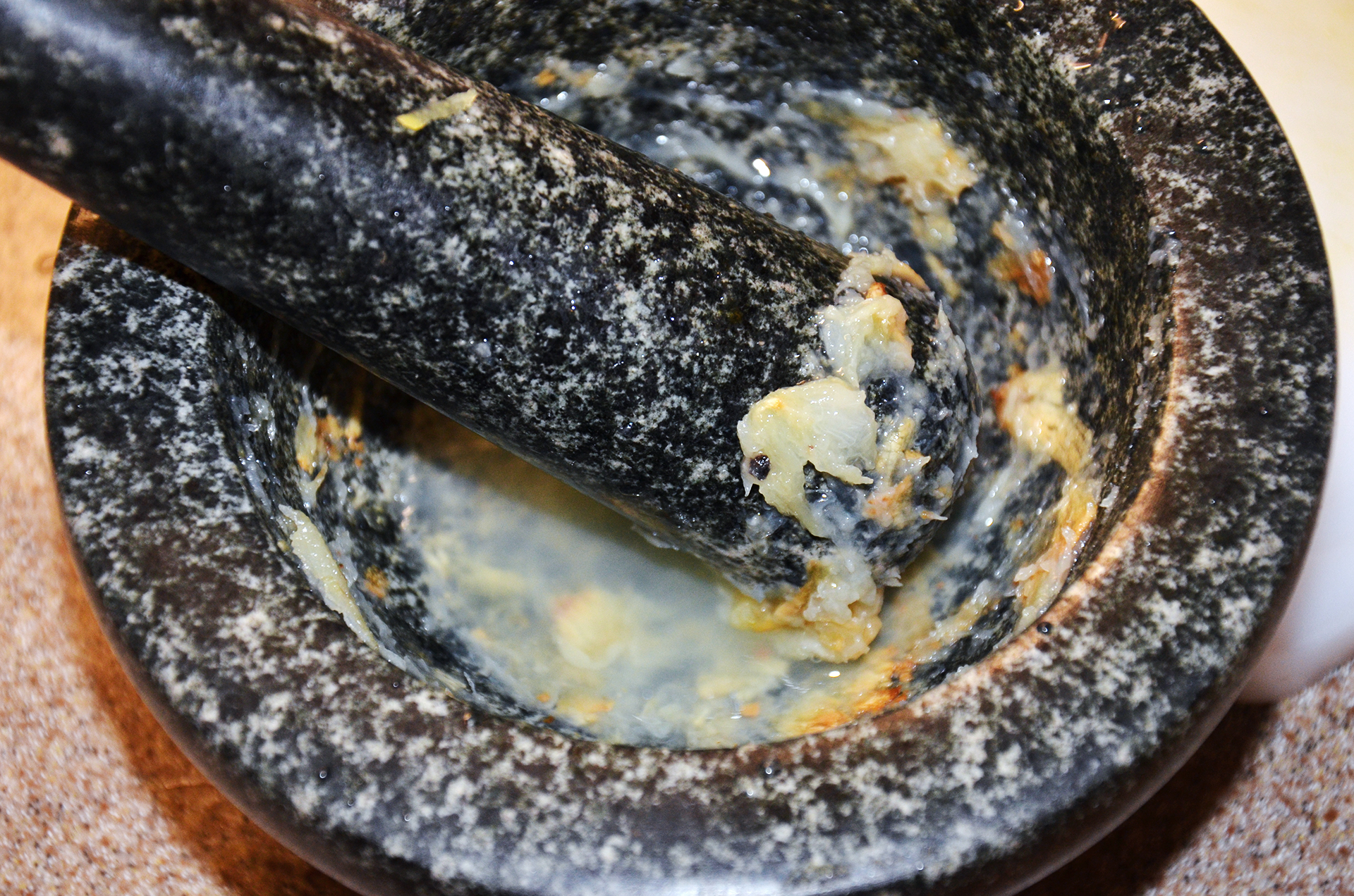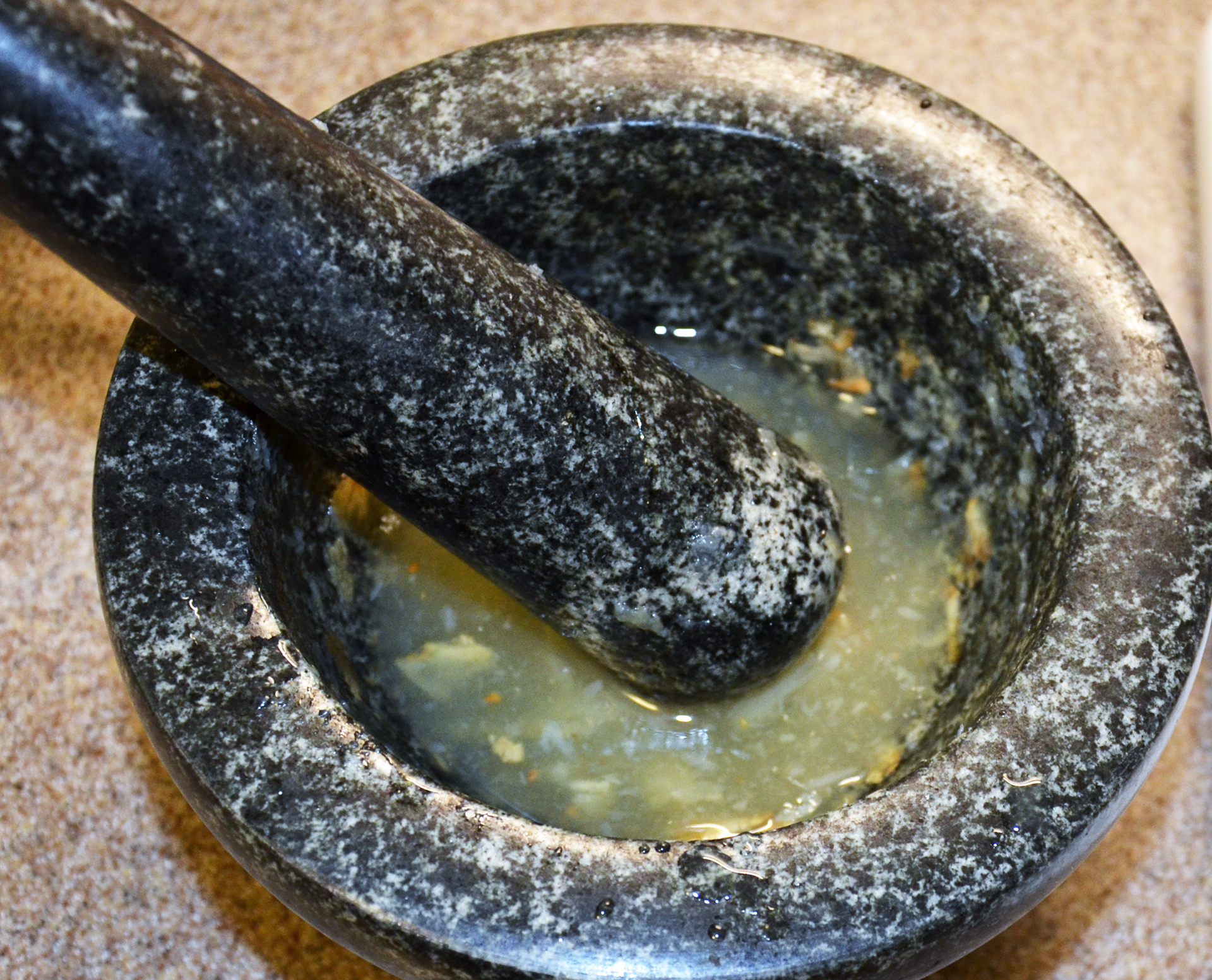 Заправка. Перетрите в ступке запеченный чеснок. Добавьте мед, соль сок лимона и оливковое масло. Перемешайте.