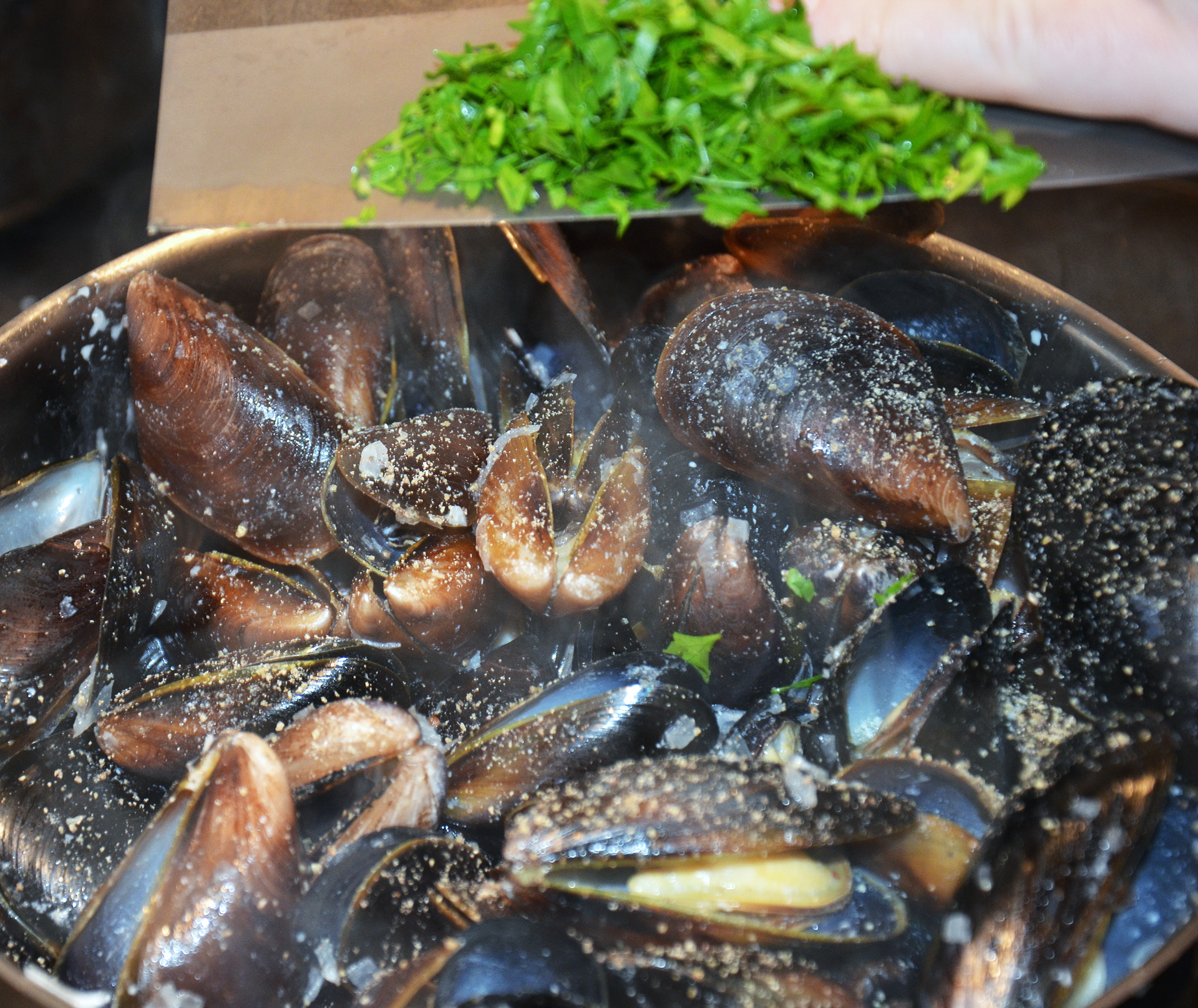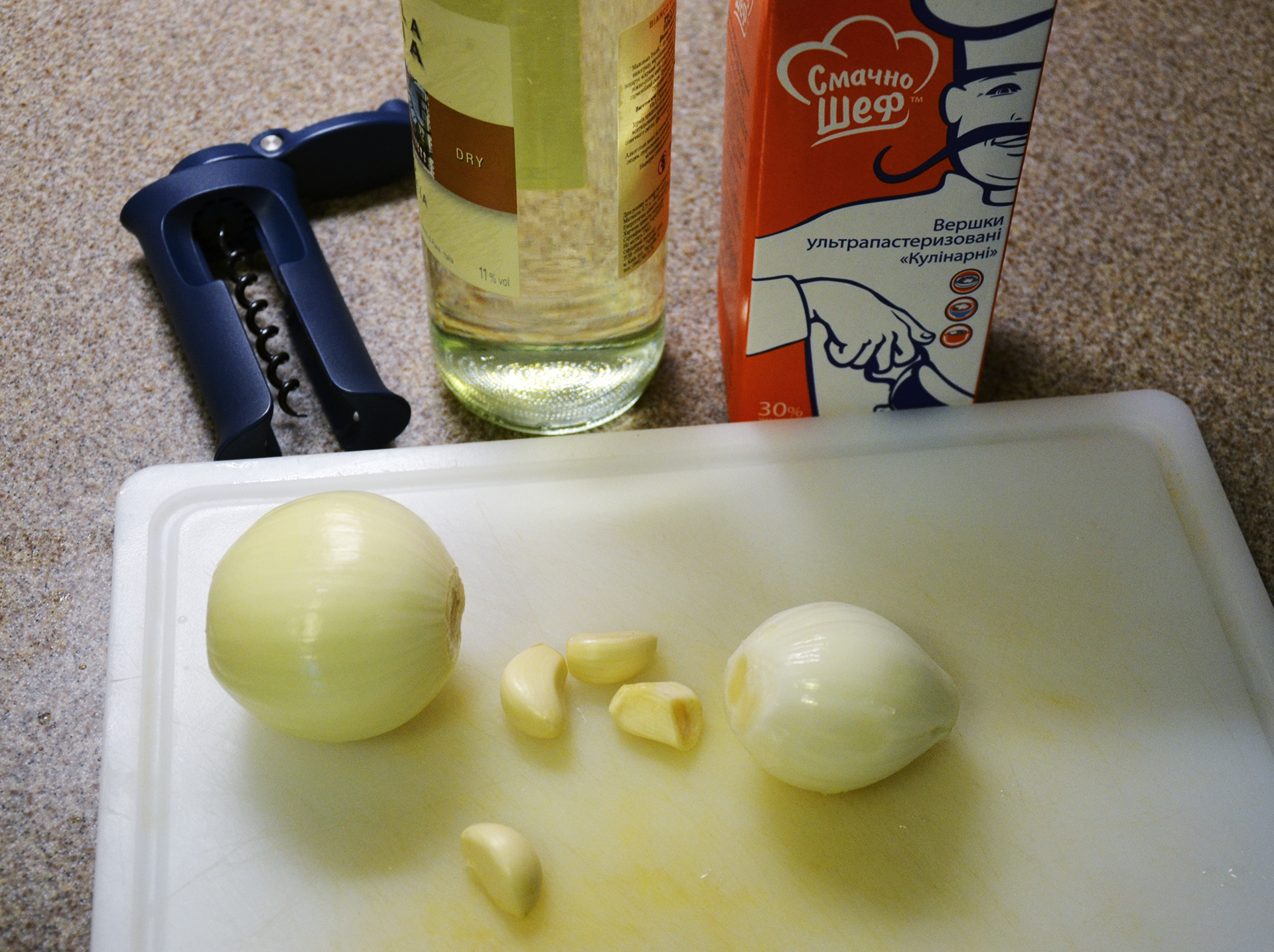 В оливковом масле обжариваем лук и чеснок. Закидываем мидии. Заливаем белым вино и выпариваем спирт. Заливаем сливки.