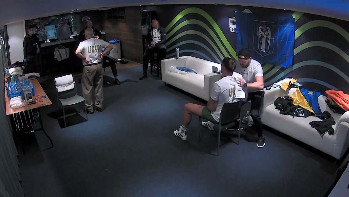 Герб Киева у него в раздевалке, флаг Украины в раздевалке, усрацца