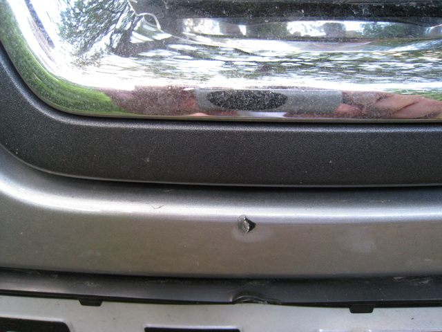 На выходных ездил на дачу, так вот там какие-то с..е соседи чего-то вкопали почти прямо на дороге металлический штырь арматурного типа, еще и не высокий и никак не выделенный например цветной краской. Вообщем немного на него наехал передком, основной удар приняла на себя номерная рамка и номер но досталось и верхушке бампера, в результате чего образовался вертикальный скол около 8 мм в длину и 3 мм в ширину (см. фото). Маленький, а не приятно. Хочется заделать. Понятно, что пластиковый бампер ржаветь не будет, но глаза мозолит.