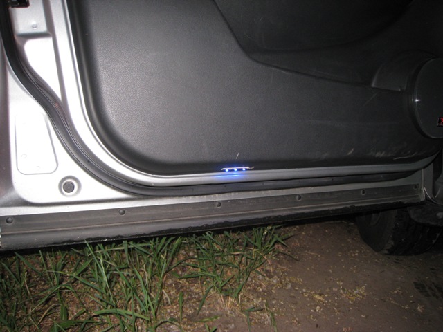 о наболевшем: когда поздно приезжал домой парковался под домом а там после дождя лужи, грязища, из машины выходиш и эта грязища уже на обуви. надоело. поехал на радиорынок купил светодиодики 2 пластинки по 3 диода на каждой (2,5 грн за пластинку) выдернул знакомого электрика (100 грн) и за полтора часа поставили подсветку, крепил на двусторонний скотч, после 3ей мойки скотч отпал взял тюбик суперклея и поставил на место все гуд. питание на диоды завели с датчика сигнализации на открытие дверей. двери открыл горит закрыл погасли. свет яркий.