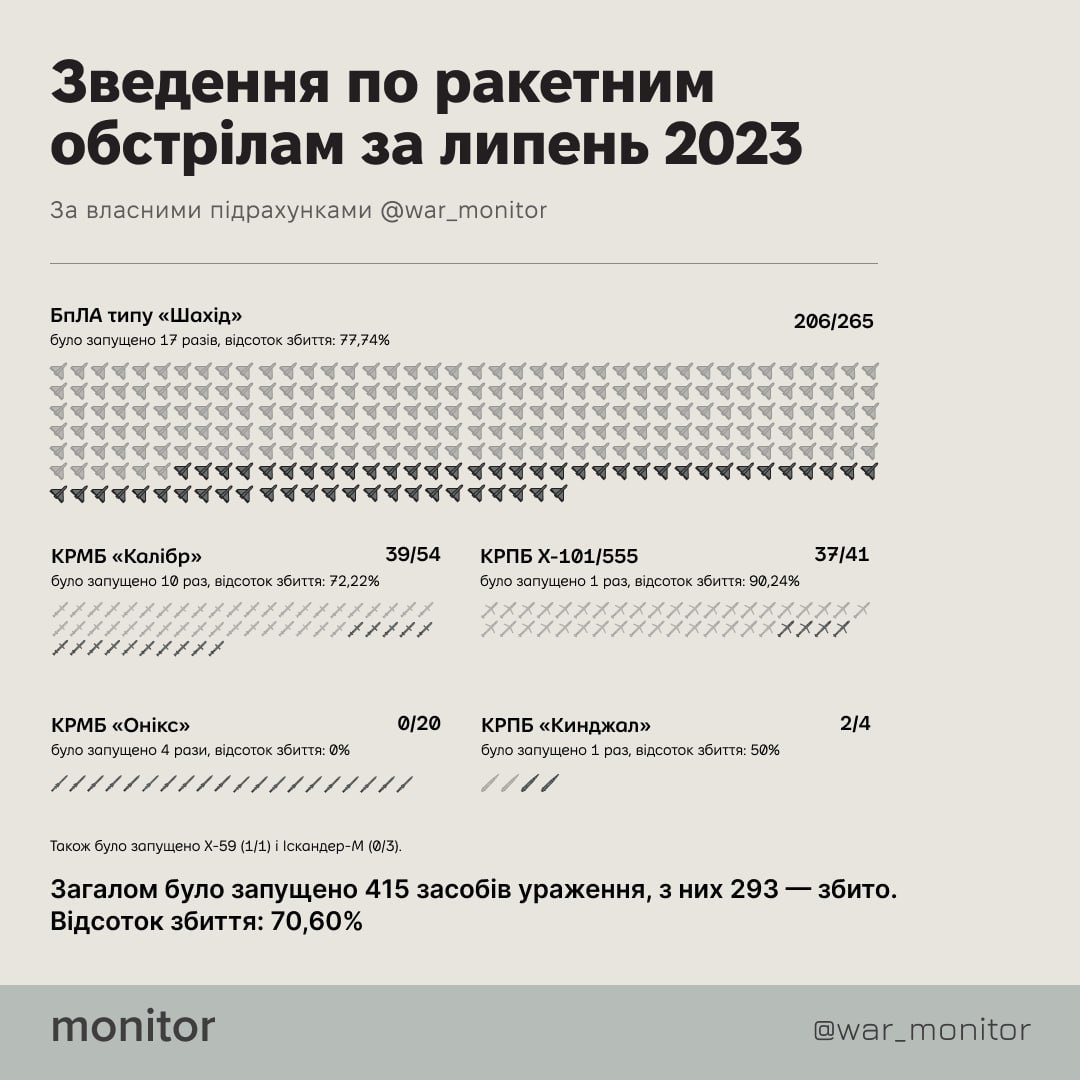 Кацапи выпустили по нам за липень: 54 Калібра, 41 Х-101/555, 20 Оніксів, 4 Кинджала, 3 Іскандера-М. Це приблизно стільки ж, скільки немита виробляє ракет за місяць. Довоювались асвабадітєлі, все використовують прямо з коліс, колишні багатотисячні запаси вже на нулі. Хіба що, радянських С-300 в них на складах, як лайна за баньою. Бідні Харків і Херсон (бо далі вони не долітають).