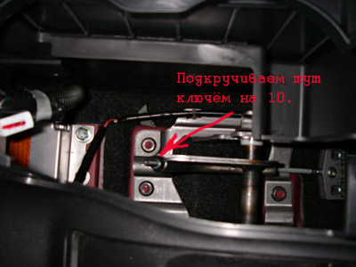 Просто там все, вынимаешь палстмассовый подстаканники что возле ручника, вынимается без всякого инструмента, прост аккуратно тянем на себя, вооот, как откроешь, потяни ручник, увидишь там рычаг который двигается, на его окончании есть гайка ( помоему на 10 ), вот ее и надо подтянуть.