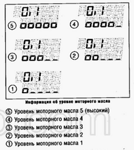 А ещё если немного дольше подержать кнопку компа, то появляются пять кубиков по которым следишь за уровнем масла, а ближе к замене их может остаться три или два, как у кого. Но это ещё не значит, что сразу масло надо доливать. Мне например, уже пару сотен км. до ТО-3 осталось и я масло не доливал, и вообще, между заменами не доливал ни разу.