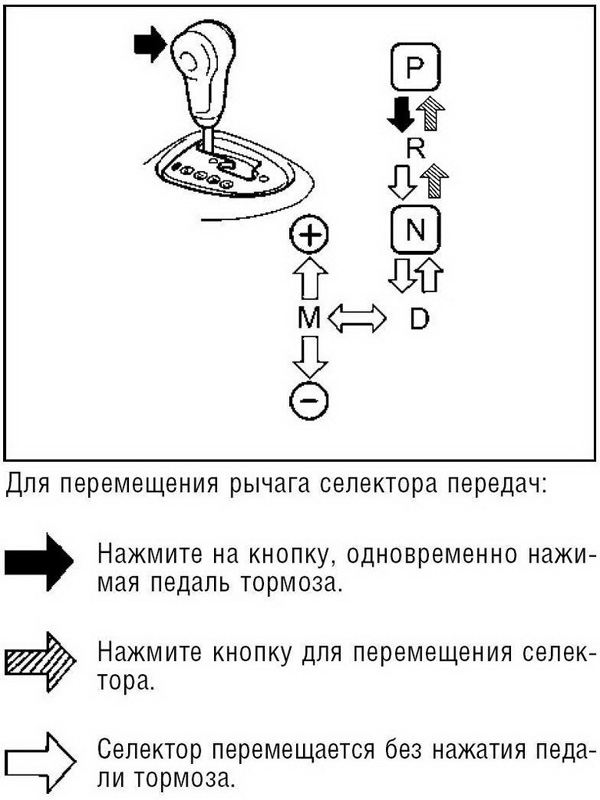Кнопка на ручке - защита от дурака, чтобы случайно не сдёрнуть с D на R во время езды. Нажимаем пальцами кнопку - и получается сдёрнуть, не нажимаем - не получается. Единственная фигня - эторасположение кнопки прямо под пальцами, т.е. случайно нажать на неё всё-таки можно. Вот из мурзилки: