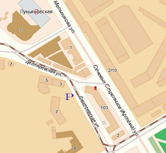 Вход обозначен красным квадратиком, стоянка - за домом синяя буква Р: