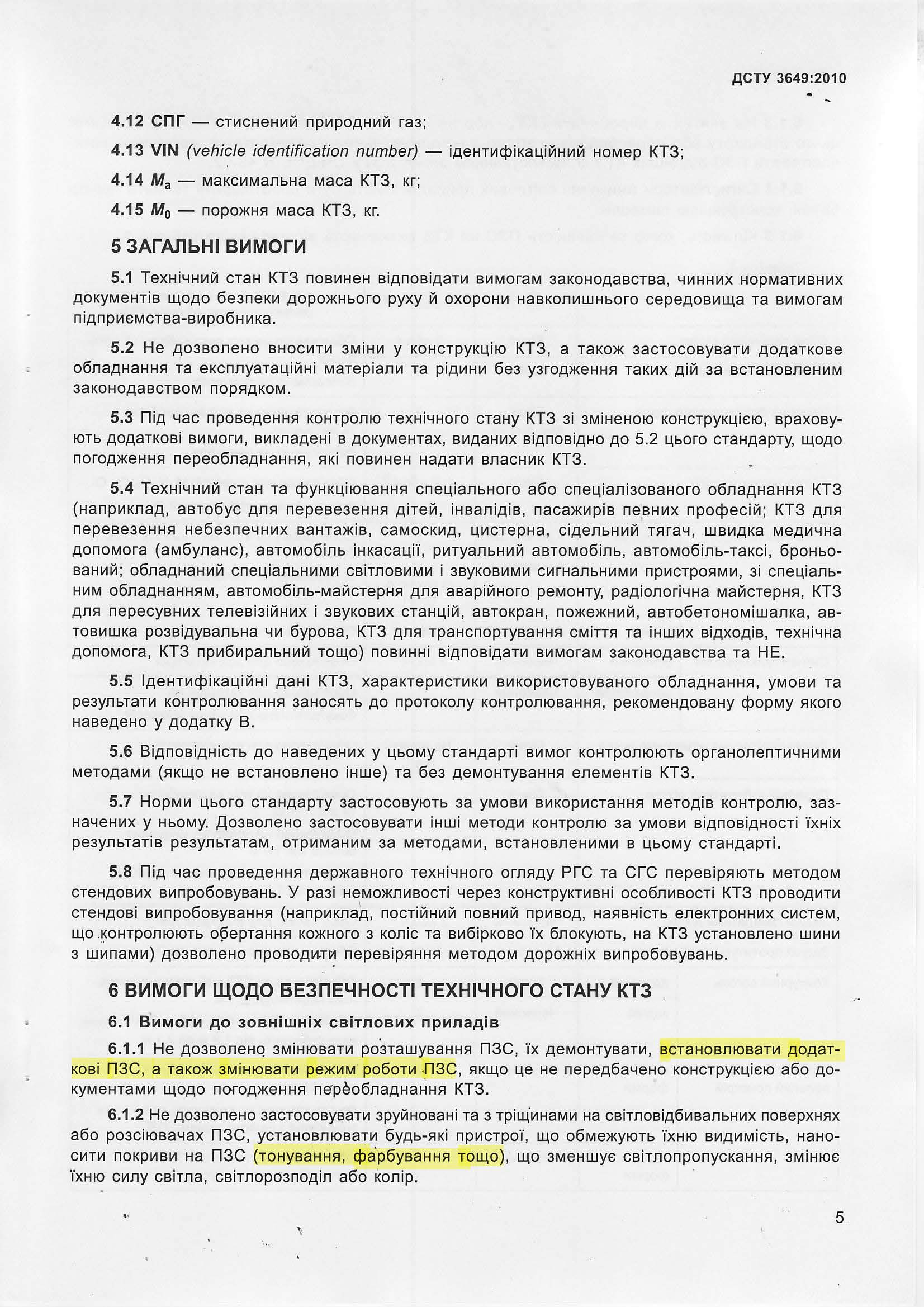 http://zakon4.rada.gov.ua/laws/show/111-2013-%D0%BFи еще есть требования ДСТУ 3649-2010 Колісні транспортні засоби. Bимoги щoдo бeзпeчнoотi тexнiчнoгo cтaнy тa мeтoди кoнтpoлювaння. Раздел 6