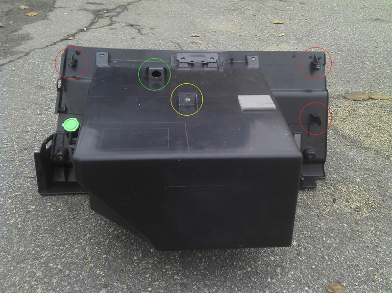желтым - крепление для винта который можно не заметить при снятии бардачка