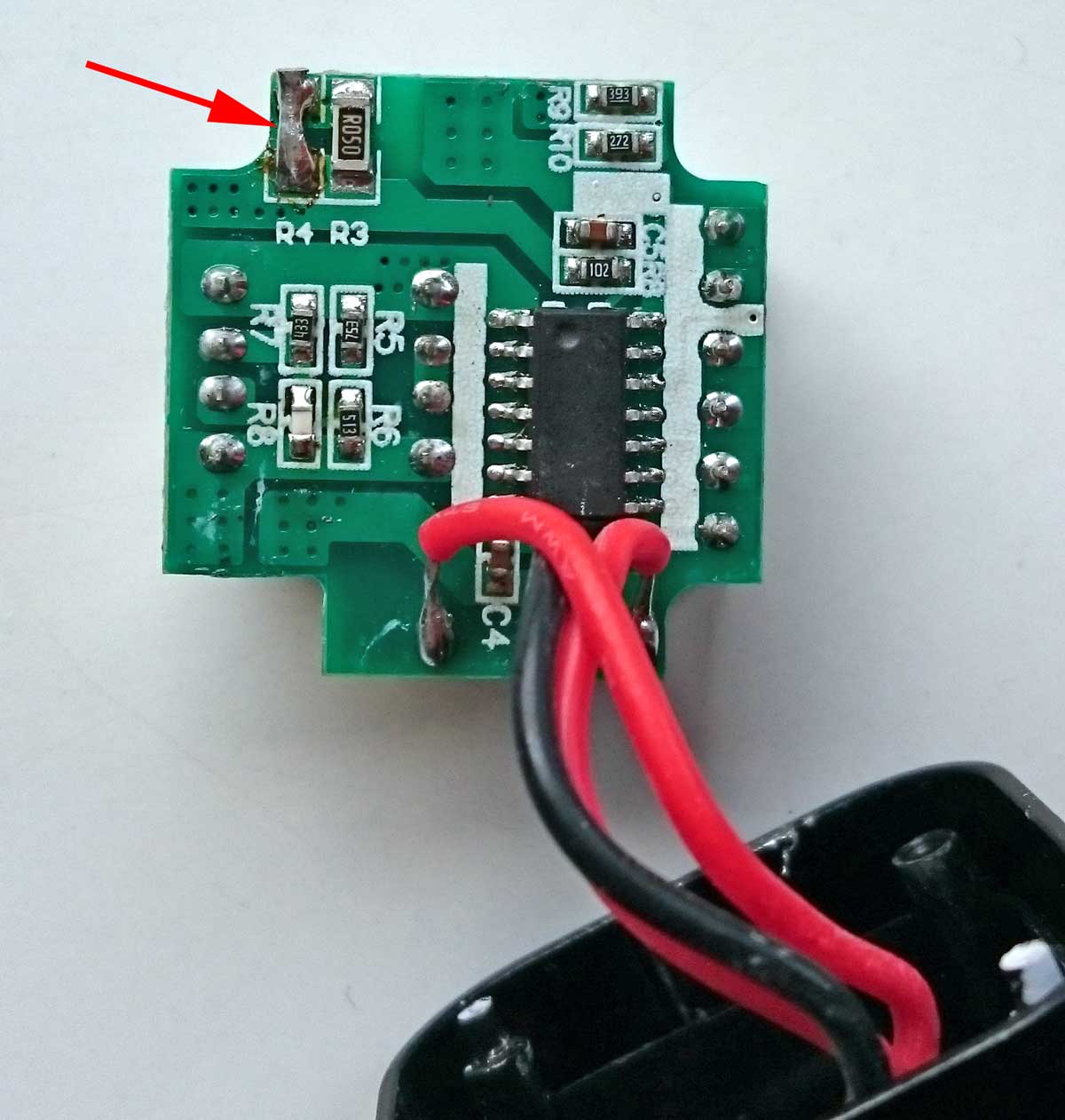 Короче говоря разобрал, хотя устройство неразборное. По 4м углам передней панели изнутри есть штифты, благо только два из них были приклеены наглухо и при разборке сломались (на фото виден побелевший сломанный штифт в нижнем правом углу), оставшиеся два целых пригодились при сборке. В качестве шунта служит резистор R3=0.5 Ом. Место для параллельного резистора R4 было пустым, куда и бала запаяна мощная перемычка (тонкий провод не пойдет). Режим амперметра удален, прибор показывает напряжение независимо от нагрузки в USB