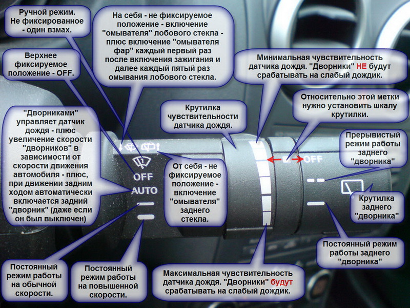 3. "AUTO" - "дворниками" управляет датчик дождя - чувствительность регулируется крутилкой (длинная полоска - слабая чувствительность, короткая полоска - сильная чувствительность)