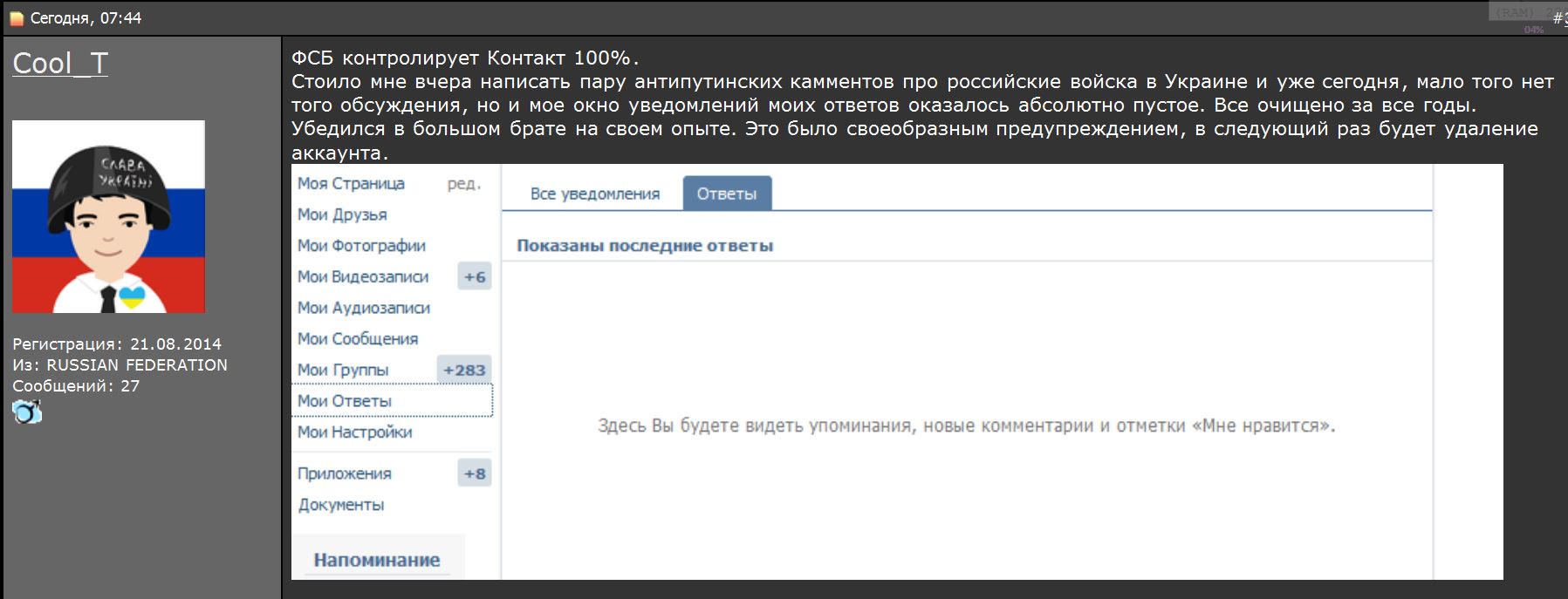 2014 год – война с Украиной. Чтобы не начинать братоубийственную войну Украина не ведет боевых действий за Крым. Кацапье воспринимает это как слабость и начинает войну на Донбассе. Как только украинская армия начинает серьезные боевые действия в ответ, русня 24 часа в сутки вопит от страха о хунте, карателях, американском спецназе и польских танковых бригадах. Один украинский флаг в центре Москвы заставляет всю Эрефию обоссаться от страха. Вы всерьез считаете, что герои себя ведут именно так?