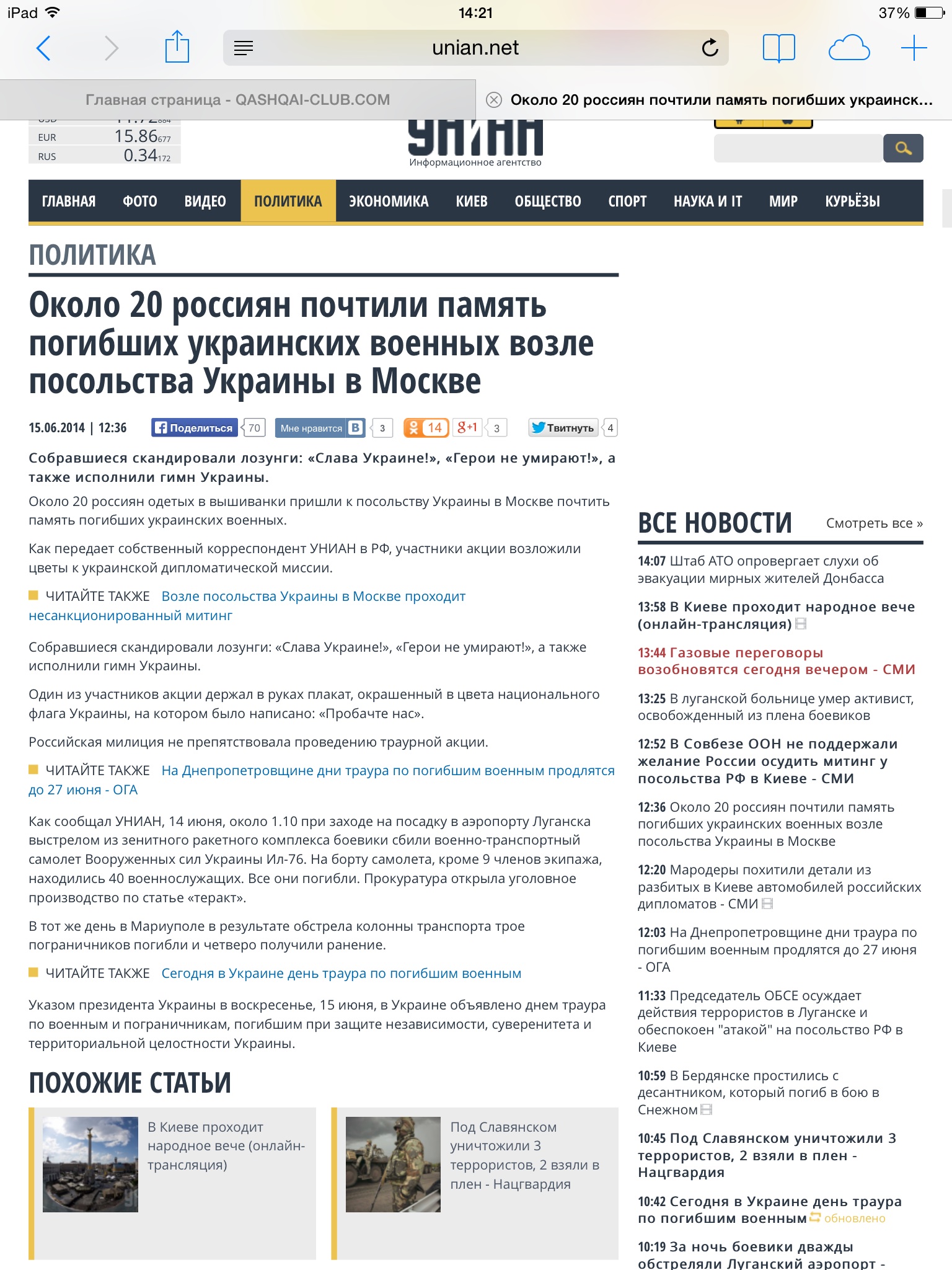 Около 4 часов вечера информация о танках под российскими флагами, «гуляющими» по Восточной Украине, появляется в прессе.