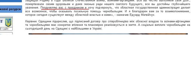 Глава Одесской областной государственной администрации Эдуард Матвийчук в очередной раз шокировал, теперь уже не только представителей СМИ, но и энергетиков. Многие из них так и не поняли, что он имел ввиду, когда в официальном поздравлении по случаю профессионального праздника назвал их «служителями энергии и вершителями света». Этот, уже не первый за время пребывания на посту главы облгосадминистрации, «перл» губернатора, — сообщает интернет-издание «Взгляд из Одессы». Еще одним «открытием» Матвийчука стали «ладони работящих рук» энергетиков, благодаря которым, оказывается, электроэнергия и попадает на предприятия области. Ранее сообщалось, что поздравление Матвийчука одесситам на День города содержало 5 грамматических ошибок, его любимое стихотворение «Жди меня», как он сам считает, написал не Симонов, а Рождественский, а академика Сахарова, по его же мнению, звали Дмитрием... Во время посещения 57-й одесской школы оставил запись в журнале, где сделал несколько грамматических ошибок: «Память о подвиге нашЫх отцов и дедов, останется в нашем сердце навсегда и будет служЫть примером для подрастающих поколений».