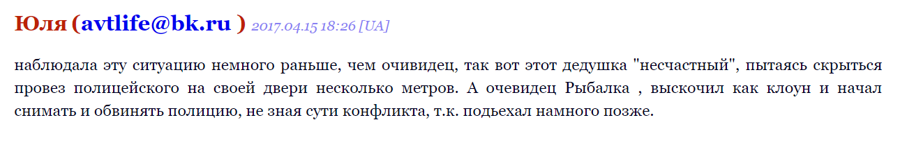 До речі, бабулька чи дідусь, які плюють вам в лице - такі ж хулігани, як і молоді недоумки. У тексті є посилання на закон о поліції, де йдется про поводження з людьми похилого віку. Будь яка людина, котрій заламують руки за спину буде упиратися. Навіщо поліцейським було заводити старій людині руки за спину - от у чому питання. Чому треба було відвозити до відділку? Бо не було доказів його порушення і треба наказати "вумника", що не повівся на розвод від копів? Скріше за все - так.