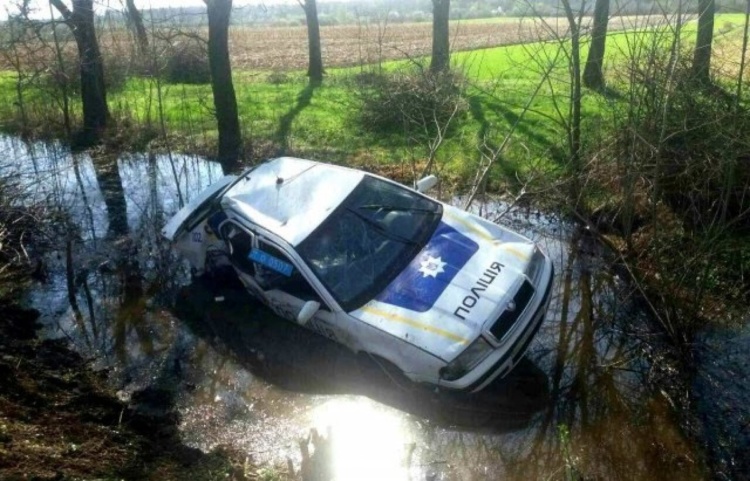 Далі світло на події проливають вже фото: поліцейська машина вилетіла з дороги і потрапила в болотисту місцевість. Судячи з усього, відновленню авто не підлягає.