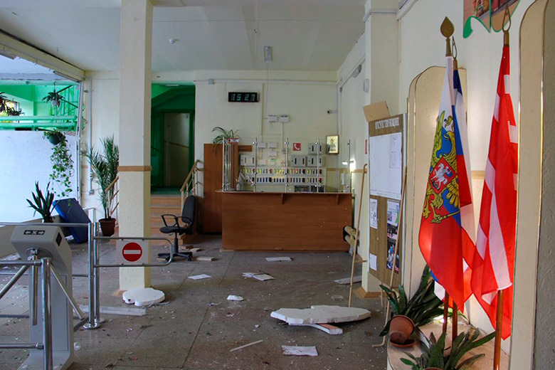 Вот еще, на тему разрушений вестибюля. Взрыв был такой силы, что окна повылетали с рамами, а внутри вестибюля как-то так.. Выше уже писал - стены чистые, не то что повреждения, без пыли даже, доска с обьявлениями стоит, флаги, горшки стоят, перегородки гипсокартоные нетронутые, стойка стеклянная, ключи все на месте (или что там?), даже икона на месте удержалась..