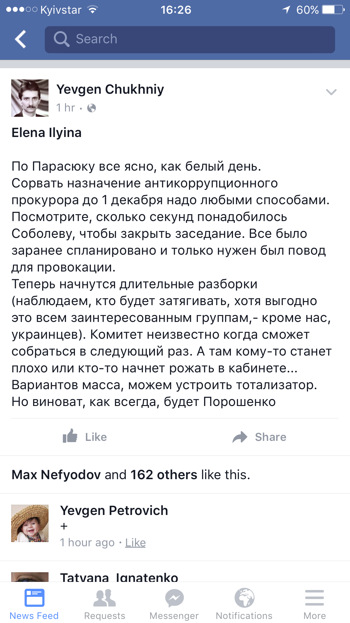 А есть доказухи? Давай зашлём Бутусову, Лещенко и Ко? У них свой шкурный интерес имеется. А у меня ещё парочка Жарикова знакомых независимых есть, Бигус Денис тот же, Оля Худецкая, Женя Кузьменко. Даже целый депутат знакомый есть - Сергей Высоцкий. Да и у Артёма Шевченко можно комментарий попросить. Только нужны имена, места, факты, явки, пароли, а не догадки. Если это инфа от твоих источников, давай брать их в работу, пусть не молчат, дают показания. Ну или хотя бы анонимное интервью для начала. Чего мы все тут жалуемся, надо что-то делать. А то сливают реформы, и так сольют с нашего молчаливого согласия... Это не стеб, Саня, я вполне серьёзно. Вопрос серьезный. Считаю, замалчивать и спускать с рук такое нельзя. Мы же не за то на Майдане...