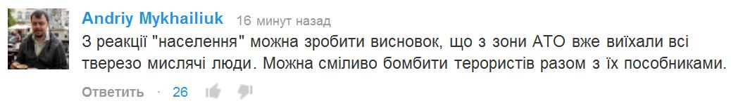 А никто у вас там не задумывается над простейшей военной целесообразностью обстрела мирных улиц? Просто сесть и подумать 2 минуты. Какой смысл в этом для украинской армии? Настроить против себя мирных? Тупо. А если это сепарасты стреляли и свернули на армию? О, в этом есть большой смысл: мирные начнут проклинать укр. армию, кто-то из местных рванёт рубаху и запишется в сепарасты, лайфньюз покажет горячий сюжет про "нацо-фашисто-бандеровцев".