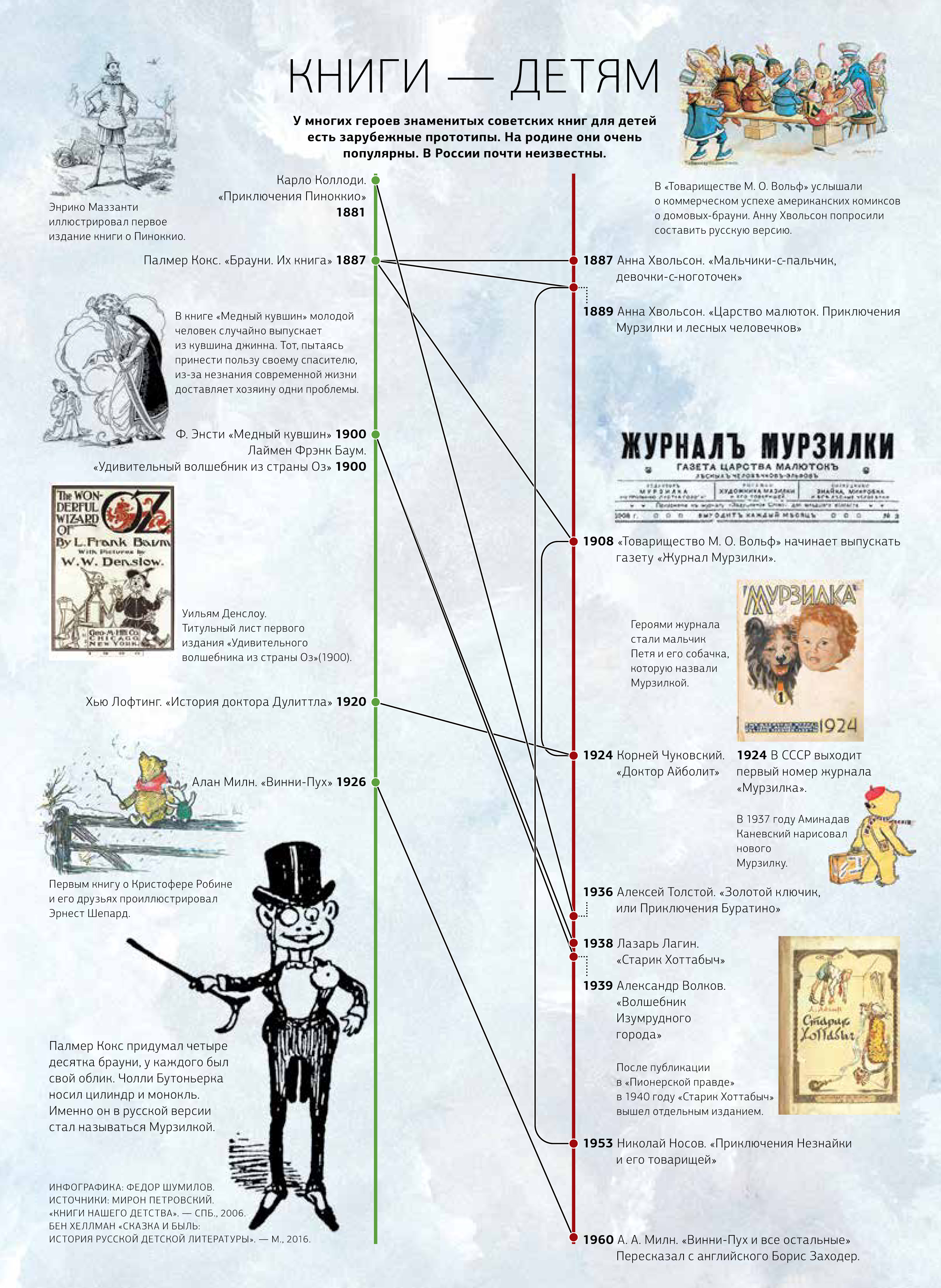 Малыши из «Незнайки» Николая Носова взяты из дореволюционной книги Анны Хвольсон «Царство малюток», которая, в свою очередь, опиралась на истории о сказочных существах брауни, которых придумал Палмер Кокс.