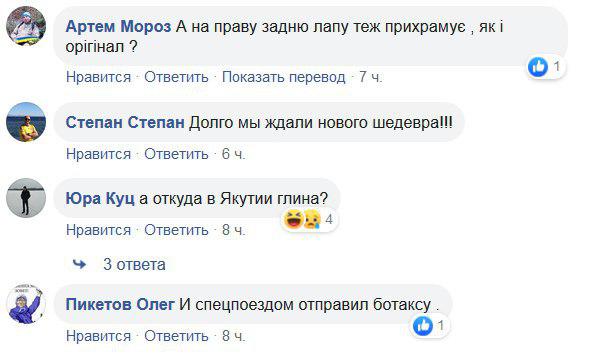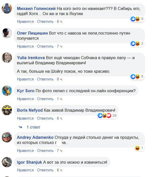 В сети поднялась волна шуток из-за такой скульптуры Боппосова. "Вова, ты ли это", "Просили слепить Путина - слепил! Вот же молодец!", "Вот еще чемодан Собчака в правую лапу - и вылитый Владимир Владимирович", "Его творчество как глоток свежего воздуха", "В нормальной бы стране, давно бы профинансировали мужика, чтобы он реальные скульптуры делал", - пишут в комментариях.