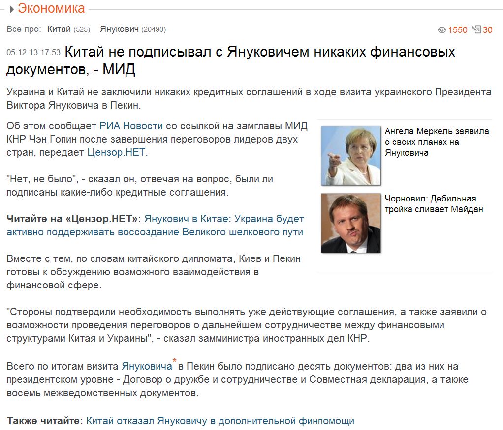 Китайці - не дУрні, як звик вважати Батя. Вони миттєво трансформували два десятки конкретних угод, які мали підписати, у меморандуми! А тут вже бабка на двоє гадала... Більше того, яник просив їх надати, увага, допомогу без вимог повернення на пару деястків мільйонів. Був успішно скерований в той самий сувнірний супермаркет, що вже фігурував у нас на форумі. Отакє...