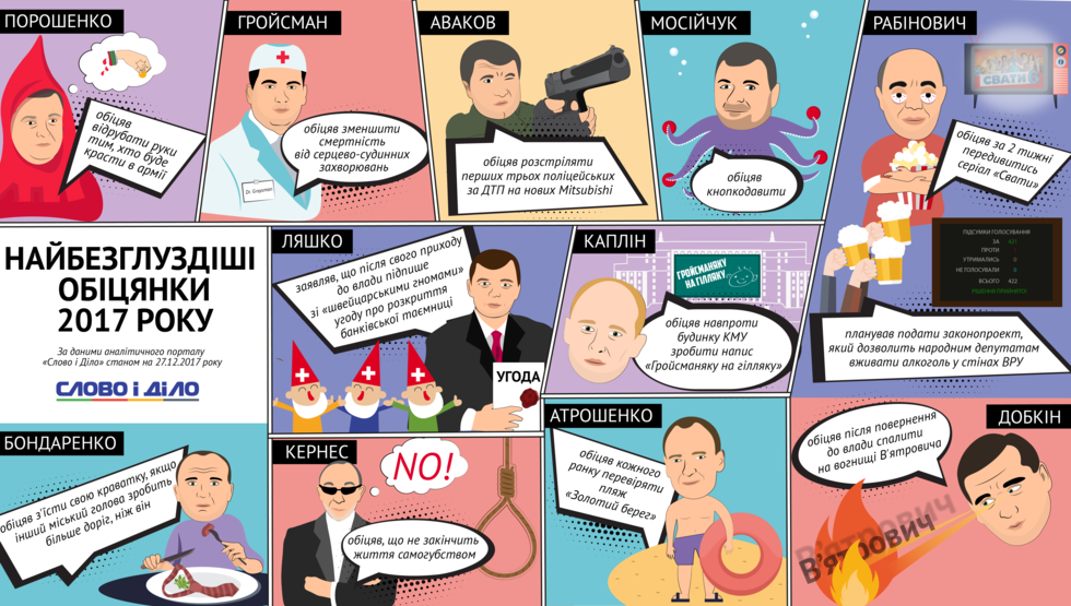 Портал "Слово и дело" подготовил инфографику о самых нелепых обещаниях украинских политиков в 2017 году.