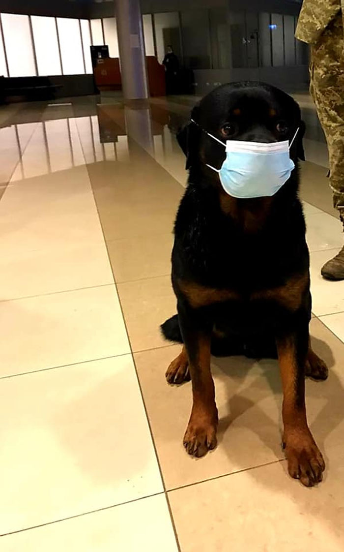 В сети появились фото служебных пограничных собак в аэропорту «Борисполь» в медицинских масках. Очевидно, таким образом животных подготовили к появлению коронавируса в нашей стране.