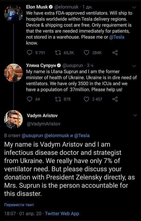 То есть по логике зе-стратеджиста Маск должен лично позвонить гундосому и предложить ИВЛы, так как лично Супрун ухайдохала все ИВЛы в стране. И вот все же было классно, когда аристов работал врачем, а не звенел на фейсбуках и твиттерах. )))