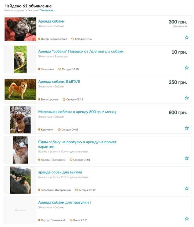 Поэтому на платформе "OLX" появилось множество объявлений, где люди предлагают в аренду своих любимцев. Цена: от 100 до 800 гривен за час.