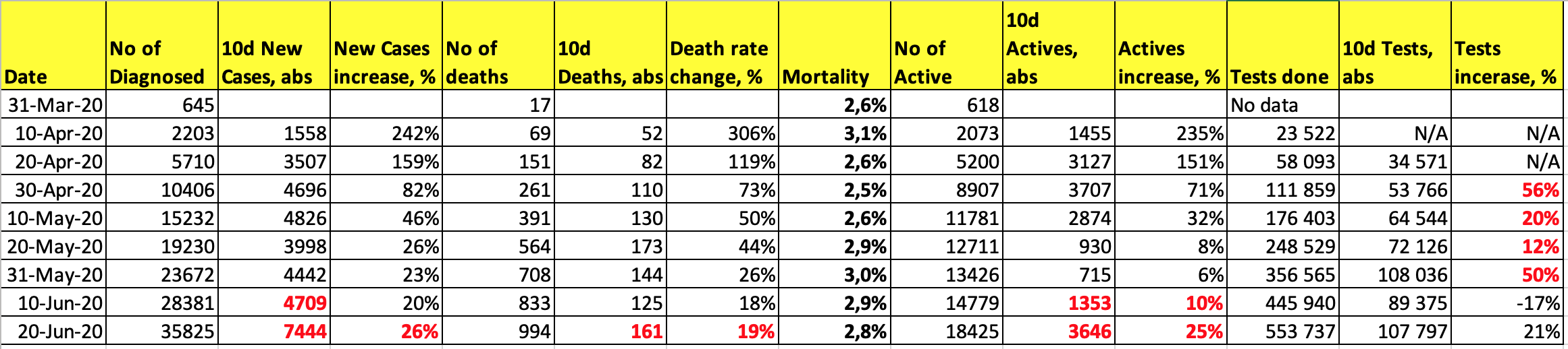 STORMСмотри, я тут свёл в кучку всё, что нарыл на ресурсах ЦГЗ МОЗ и Ворлдометре за два месяца и 20 дней по 10-дневным периодам.Думаю, ту ясно видно, что новый всплеск пошёл уже после окончания периода актиого наращивания мощностей для тестирования и даже на фоне спада в тестах, то есть тотальный типа скрининг всех подряд не разбавил ситуацию В пользу этого говорит и число активных кейсов, растущее прямо пропорционально, то есть людей, которые имеют клинические формы и требуют лечения.