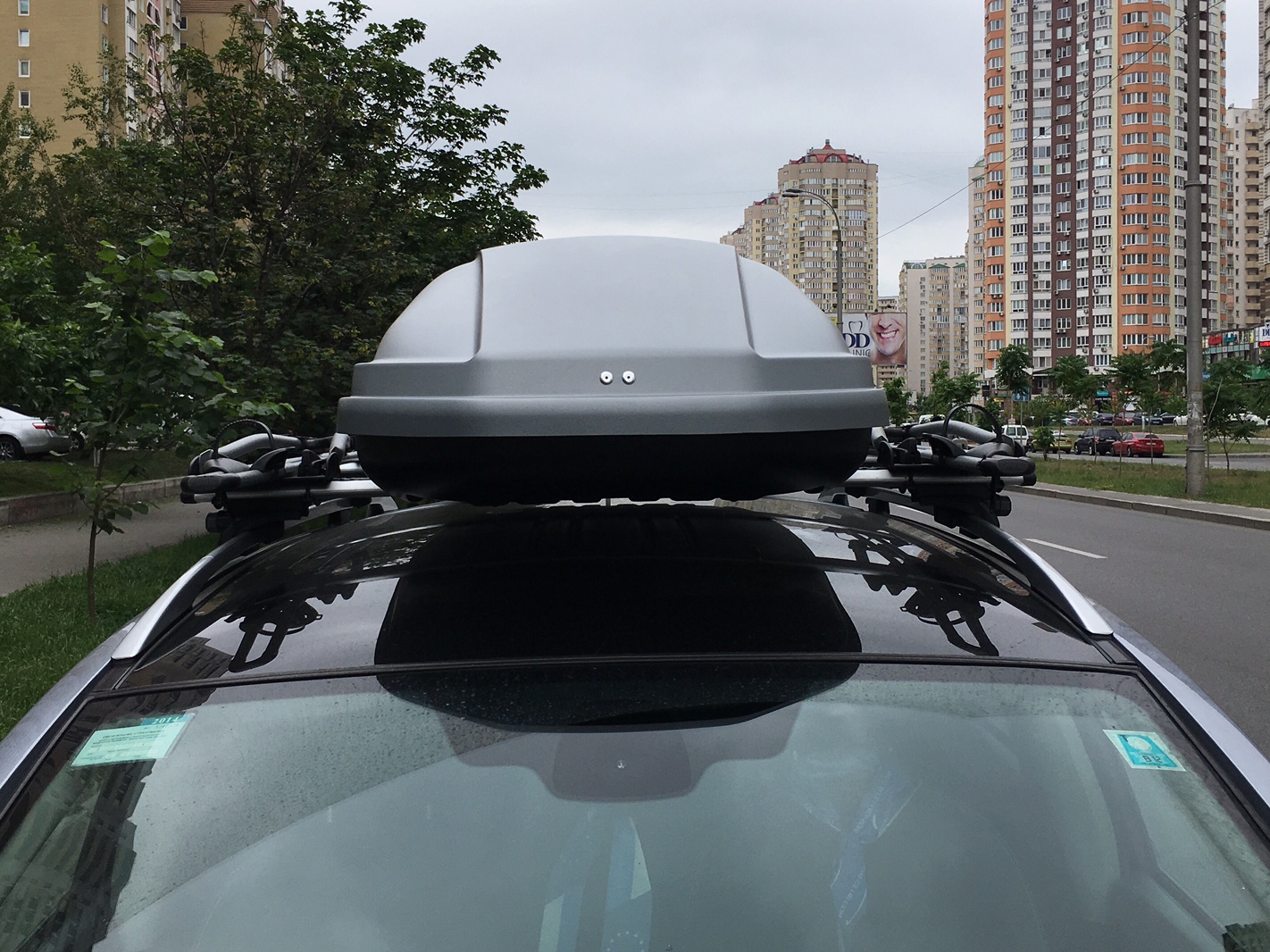 Встал удивительно удачно в штатные свои отверстия и на ту конфигурацию поперечин, что была установлена под велики с самого начала эксплуатации багажника, то есть не пришлось ничего никуда двигать, кроме велокреплений (их разнёс максимально по краям). Два замка под один ключ, стяжки в комплекте (установлю чуть позже), качество пластика и сборки очень достойное. Пустой, естественно, дребезжит и вибрирует, если прислушиваться и присматриваться, но под нагрузкой будет самое то. Внутри знак оганичения скорости движения с ним - 130 км в час. В паркинг въехал без проблем, на паркоместо поместился. В общем, доволен!