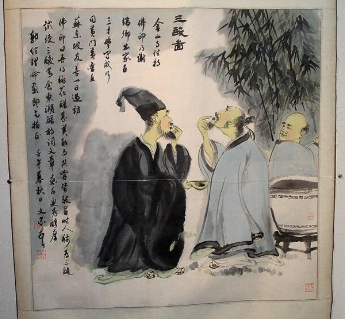 По-китайски этот сюжет называется «Пробующие уксус» (尝 醋 图). Кто же эти трое? И почему у одного из них лицо искривившееся, у второго – скорбное, а третий улыбается?
