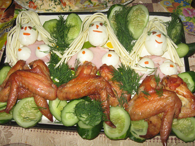 как варианты рассматриваю рулетики из кальмаров, салат с мордашкой лошади с телятиной и клюквой, и прочее..
