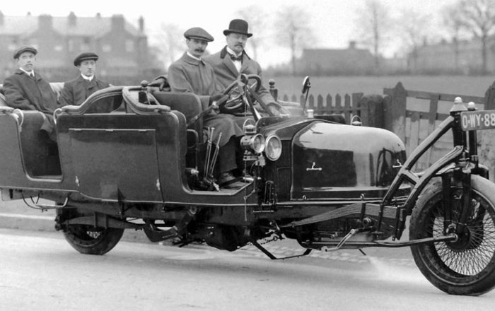 Пассажиры сидят спокойно, не балансируют, как канатоходцы. .И как эта штука не падает? Оказалось, это гирокар, устойчивость обеспечивает 600 килограмовый маховик( считай гироскоп). В котелке, рядом с водителем сам изобретатель. Снимок датирован 1914 годом. https://dimka-jd.livejournal.com/8611569.html Просто удивительно
