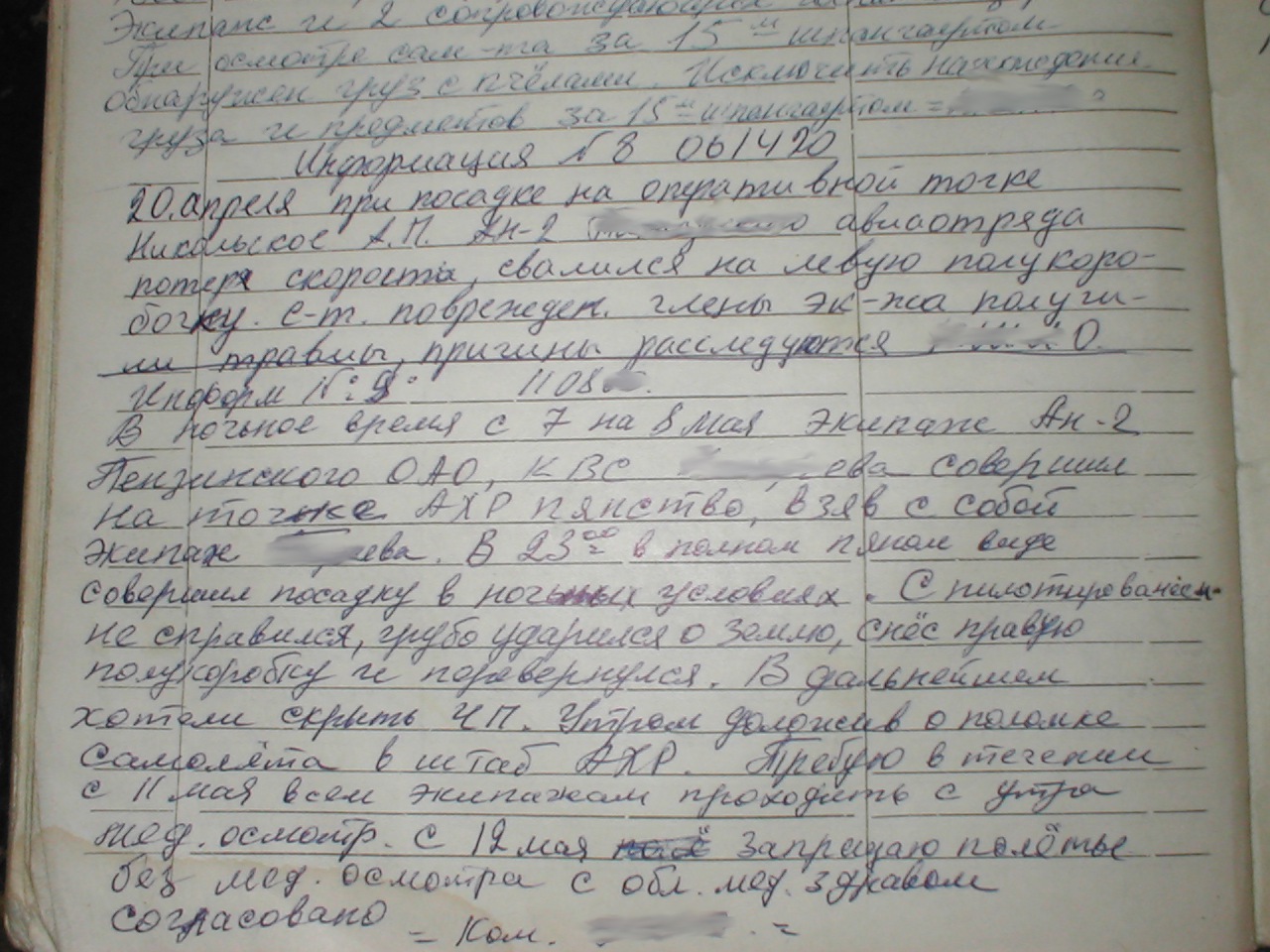 В ночное время с 7 на 8 мая экипаж Ан-2 Пензенского ОАО, КВС К***еев совершил на точке АХР пьянство, взяв с собой экипаж П**ева. В 23:00 в полном пьяном виде совершил посадку в ночных условиях. С пилотированием не справился, грубо ударился о землю, снёс правую полукоробку и перевернулся. В дальнейшем хотели скрыть ЧП. Утром доложив о поломке самолёта в штаб АХР.