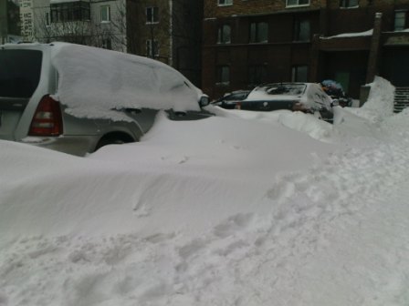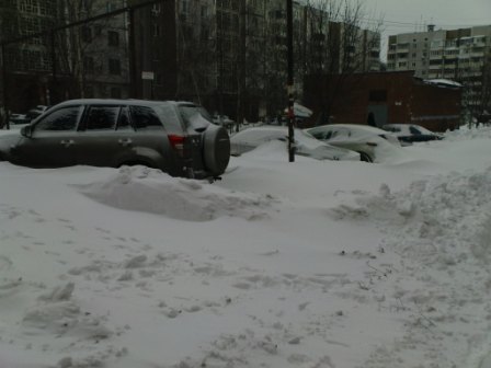 Вчера выехал утром на работу, расчистил машину и погреб. 4х4 рулит! При выезде из двора был сугроб по колено, приходилось раз десять штурмовать. Заезжаю на пузо, сдаю назад и опять с разгона. Доехал на работу практически без приключений, дороги разбиты в отличии от двором. Весь день и всю ночь шел сильный снег. Сегодня утром возвращался с работы. В свой двор уже заехать не смог. Замело по пояс. Поставил машину рядом с детской площадкой, и пошел фоткать.