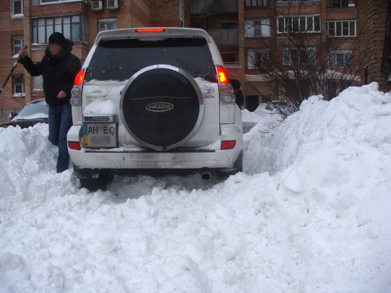 Прадо и пару человек решили расчистить проезд из двора самостоятельно, при помощи лопат. Прадо сел на пузо. Сколько не копали, так он и не сдвинулся с места. Сзади подъехал ssang young kyron дизелек. Я пошел достал свой трос, по ходу действа приходилось помогать и подсказывать участникам кому, что делать. А то люди не понимали смысл пониженной передачи и блокировок дифференциалов.