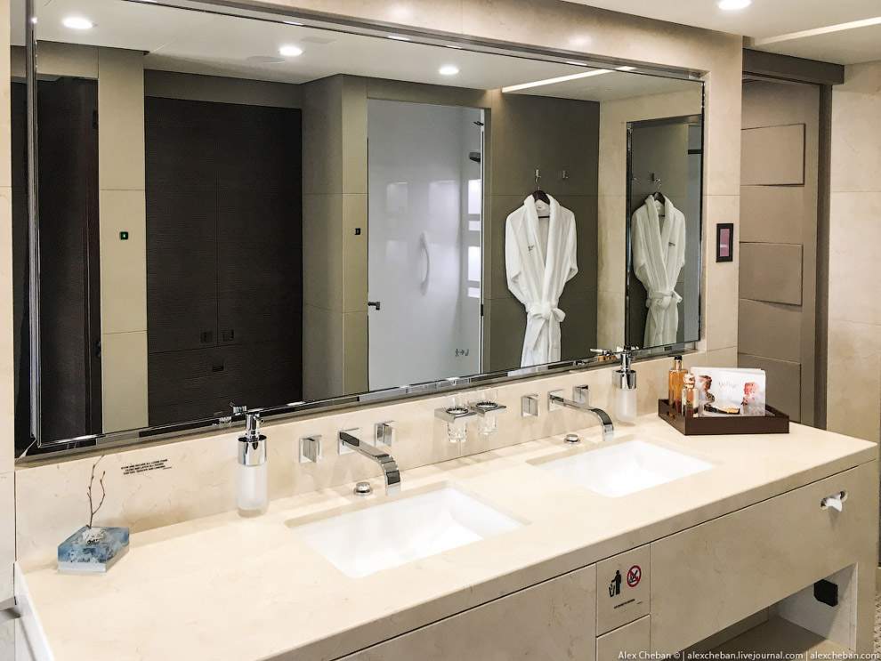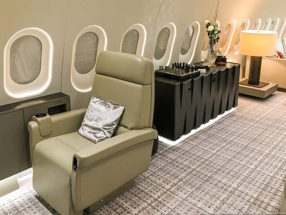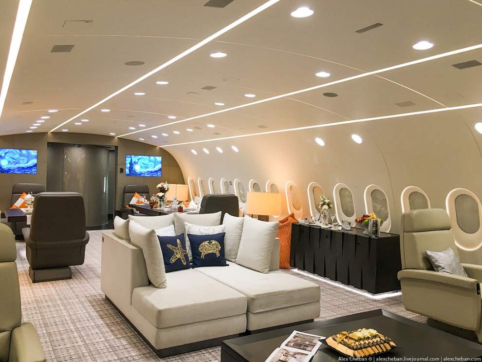 - в самолете три зоны — лонж и гостинная в центральной части салона, спальня и душевая в носовой части салона, и гостевой салон с креслами бизнес-класса в компоновке 2-2-2 в хвостовой части.