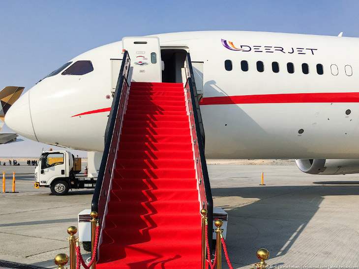 Кроме Дримлайнера во флоте DeerJet также находятся Gulfstream 550 и 650, а также Boeing 737BBJ. Но DreamJet, конечно же, является флагманом флота. Самолет удивляет шикарным и очень стильным интерьером, хотя к я бизнес-джетам отношусь без фанатизма, но большой широкофюзеляжный самолет — это же совсем другое дело!