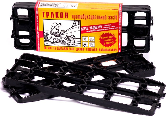 Катаю в багажнике траконы за ~70 грн. Для себя использовал один раз, когда возле гаражей оба ведущих колеса вскочили в ледяную колею. Пару раз давал другим водителям. Помогло выехать соседу, который на 4wd залез в сугроб и сел практически на пузо. Потихоньку с траконами выгребся.