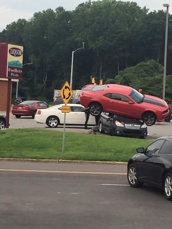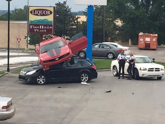 Каким-то образом Сhevrolet Camaro оказался на крыше припаркованного Subaru Outback. Судя по всему, за мгновения до аварии американский масл-кар не ехал, а летел…