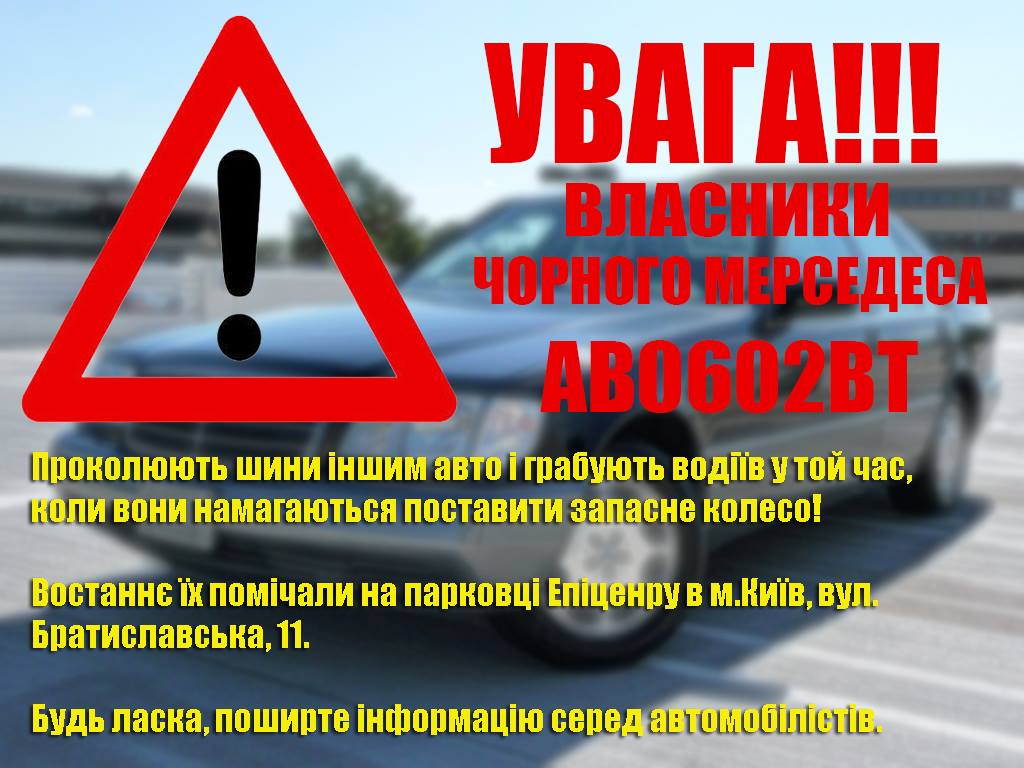 У соціальних мережах попереджають, що у Києві навколо парковок біля великих торгівельних центрів діють шахраї, які грабують автовласників, попередньо ріжучи їм колеса. Пересуваються молодики на чорному "Мерседесі" із вінницькими номерами реєстрації АВ0602ВТ.